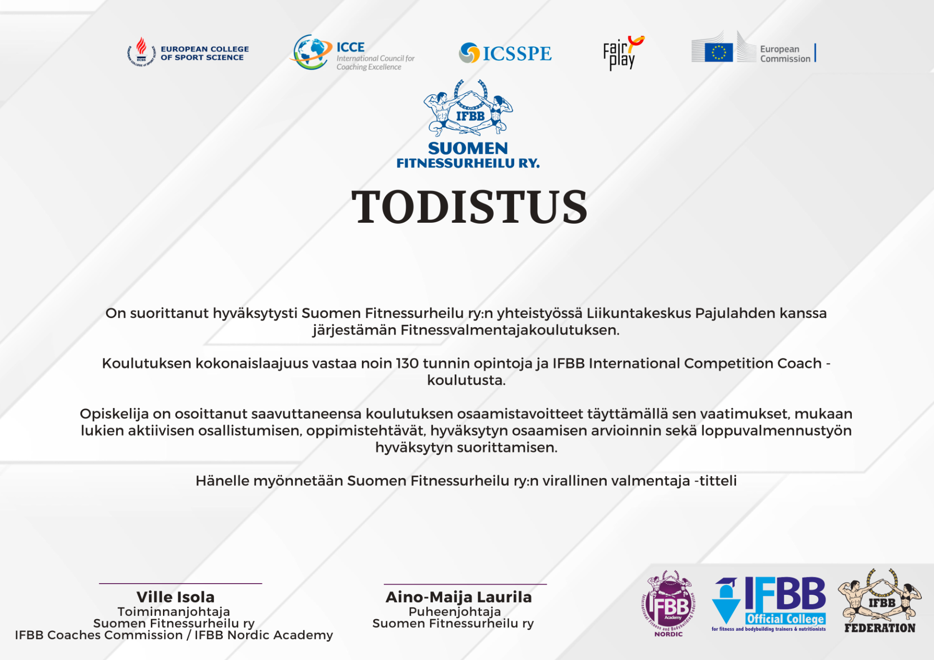 Sisältää kansainvälisen IFBB International Competition Coach -sertifikaatin (hinta 150 €).